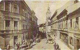 Scherschnik street. A view of Upper Square (Górny Rynek) looking towards the church under the invocation of the St. Cross. On the left, a building of the inn “At the Golden Bullock", later a hotel the Silesian House of Franz Filler who was recommending the stylish dinning-rooms equipped with air conditioning and cheap rooms with citizen's cooking. Hermann Spitzer's leather goodsbusiness can be seen the right.