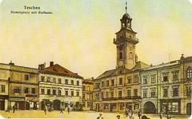The city hall in Demel Square. The Cieszyn city hall, together with a square, were built in 1496. The town hall was reconstructed many times, and its present appearance was achieved in 1844 thanks to a design by Andrzej Kment, who kept the earlier tower built by Ignatz Chambrez in 1800. On the opposite side of the city hall - is the old building of the “Brown Deer" Hotel with an adjoining tenement-house of the Seemann family.