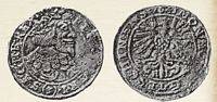 As Victor Karger thought, the new period of Cieszyn minting officially began in 1643 after a trial period. Some 3 kreutzer coins (groschens) with the initials of Dietrich Rundt (D-R) were struck in 1642. According to the contract mentioned above the mint master could strike several kinds of coins, but in practice he only minted kreutzers (1644) and 3 kreutzer pieces (1647). The obverse bore the bust of Emperor Ferdinand III, his titles and the denomination mark. The reverse presented the Cieszyn eagle and the legend which was an abbreviated version of MONETA.NOVA. ARGENTEA.DVCATVS.TESCHINENSIS. Thus only the reverse indicated the actual issuer. When the Swedish army occupied Cieszyn in 1646 Rundt had to stop minting for some time. He might have minted the undated greschel bearing the Cieszyn eagle on the obverse and an orb and cross on the reverse.