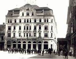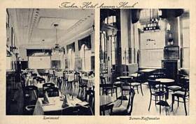 The hotel business was run by different leaseholders. In the late eighties of the 19th century the building was remodelled according to the architect Albert Dostal’s design in such a way so as to fulfill the requirements of more and more numerous clients. It was then that the second floor was added and a horse omnibus was launched, bringing guests from the Pruchna railway station at first, and then from Saska Kępa. However, these investments were not sufficient in the face of the development of the railway and tourist business at the end of the 19th century. Also, ‘The Deer’ could not compete with the ‘Austria’ hotel at Stefanii street (today’s Głęboka). Then in 1910 a Cieszyn builder Ludwik Kametz made a suggestion to build a modern hotel ‘The Russet Deer’ in place of the old one and the neighbouring town-house. He set up a partnership called ‘Hotel Brauner Hirsch GmbH in Teschen’ ( ‘The Russet Deer’ hotel, limited liability company in Cieszyn) that consisted of a group of well-to-do townspeople who bought the old hotel from Edward Seemann and the neighbouring town-house from the Scholtis family. The designs for the large new structure were made in 1911 by a Viennese architect, Kilian Köhler. In this way the most magnificent structure among those surrounding the Market was erected. It was taller and more substantial than all the others. The five-storey building got Art Nouveau decoration with rococo stylistics that corresponded to fashionable Viennese patterns. The entresol with semicircular windows, where a restaurant and café, accessible to everyone, was situated, was marked with mouldings of rustic work. The entrances, arranged symmetrically between attached columns, led to the hotel and the café. On the first floor there was an elegant suite giving onto a balcony with a wrought-iron railing. The windows were embellished with stucco work and curved mouldings. The fronton, emphasizing the symmetry of the façade, was topped with similar moulding. The fronton was embellished with a low relief representing a reclining deer (made of russet stoneware) in a neo-rococo cartouche. The building was covered with a high mansard roof topped with a wrought iron grating with the name of the hotel.