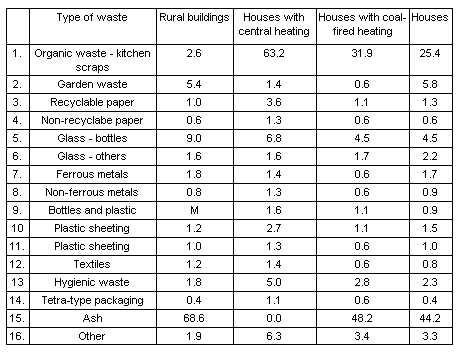 In April 1997 ZGK carried out a test of composition of municipal waste originating from 150 households (the test was carried out because of the Town Project for Municipal Waste Segregation which was being drawn up at the same time). The results show considerable differentiations in the morphologic composition of the waste dependant on the kind and character of land development and the type of heating systems installed in homes and buildings (table 18). This one-off piece of research considered only a small and rather unrepresentative choice of households which explains why the results partly differ from other similar tests and assumptions.