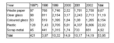 The cost reduction of storage and transport of municipal refuse to dumps in Jastrzębie and Knurów was not counted as profit from carrying out the project and neither were the 'savings' of space at the refuse-and-sludge dump in Boguszowice (resulting from a smaller amount of stored refuse) taken into account. It is estimated that in 2002 alone about 1,419 m³ of municipal refuse did not reach disposal dumps which would amount to about 71 containers of volume 20 m³ used for transporting refuse from the reloading station to the refuse dump.