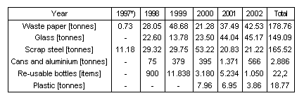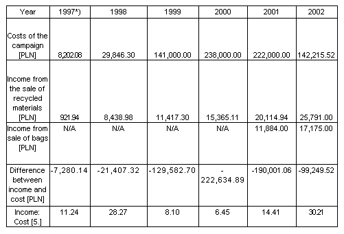 In the 4th quarter of 1997 the Town Campaign for Municipal Waste Sorting was put to practice in 450 households located in 5 pilot areas consisting of detached houses built close together. Between 1998 and 2002 the project systematically enlarged its area and the number of households included increased. Currently the Town Campaign for Municipal Waste Sorting serves all detached house residential areas; moreover, since July 2002 buildings belonging to Housing Cooperative 'Cieszynianka' in Liburnia and Podgórze Estates have been included in the project of selective collection of municipal waste. Between July and December a total amount of 4,672 bags containing sorted refuse were collected.