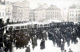 Cependant, ce n’était qu’en 1913, qu’un représentant du mouvement national, polonais, en fonction d’adjoint, put entré au Département Communal de Cieszyn. D’aillieur, on réussit d’ouvrir un collège polonais, et ensuite, une école populaire, (rue Świeży), et d’autres centres de l’éducation polonaise. De plus en plus vives disputes d’orgine nationale, au début du 20e siecle, provoquèrent, en juillet 1920, la division de la Silésie de Cieszyn entre la Pologne et la Tchécoslovaquie. Un seul organ, qui se forma depuis des siècles, fut divisé par la frontière et sur les ponts, on mit la Garde, le tramway ne circula plus entre deux bords d’une ville.