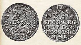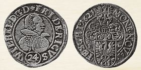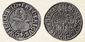 Z tego okresu (po 1624 r.) pochodzi skarb monet znaleziony w 1941 r. w Brennej-Leśnicy. Znajdowały się w nim m.in. monety księstwa cieszyńskiego z lat 1621-22. Mimo wojny książę Fryderyk Wilhelm zdążył bowiem uruchomić na nowo działalność menniczą, a na monetach wybijanych w latach 1620- 1624 znajdujemy inicjały „HL", co oznacza Hansa Losza. Wypuścił on na rynek sporą liczbę monet różnych nominałów, mianowicie trzeciaki o wadze 0,6 grama, zwane teraz greszlami albo grosikami (groszykami) z majestatycznym jabłkiem i krzyżem (1622-23), 3-krajcary, zwane w literaturze czeskiej groszami w trzech różnych typach (1620-23) oraz grosz potrójny (trojak) w 1624 r. Ten ostatni wzorowany jest na monetach tej samej wartości bitych przez księcia Adama Wacława, różnią się jedynie podobizną władcy, teraz z szyją ozdobioną hiszpańskim kołnierzem. Losz wybijał też nowe typy monet, które pojawiły się w czasie inflacji: 12-krajcarówki, a nawet 24-krajcarówkę w 1621 r. Na tej stosunkowo dużej monecie, o średnicy 31 mm, na awersie zamieszczono oczywiście portret księcia, na rewersie rozbudowany herb księstwa cieszyńskiego. Portrety księcia znajdują się także na 12-krajcarówce. Ogólnie jednak były to monety niskiej wartości, jak i wszystkie z tego czasu zwane monetami kiperowymi, bite znowu według polskiego wzoru. Nie brak też podobizny księcia Fryderyka Wilhelma na najambitniejszym przedsięwzięciu menniczym Hansa Losza z tego okresu, mianowicie talarze z 1623 r. Jest on wzorowany na talarze Rundta z 1611 r., ale książę jest tu przedstawiony w kaftanie z otwartym kołnierzem. Napis w otoku na rewersie brzmi „IN DEO MEO TRANSGREDIAR MVRVM".
