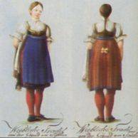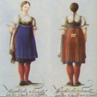 można by określić strój cieszyński noszony na terenie Cieszyna i okolic przedstawiony na najstarszych znanych akwarelach z pocz. XIX w. ze zbiorów muzeum brneńskiego. Wąski żywotek kończy się tuż pod piersiami a do niego doszyta jest spódnica. Najbardziej zaskakująca jest długość spódnicy, sięgająca tuż za kolana. Odsłonięte łydki ubrane zostały w czerwone wełniane pończochy… Wraz ze zmieniającą się modą strój ten uległ przeobrażeniom.