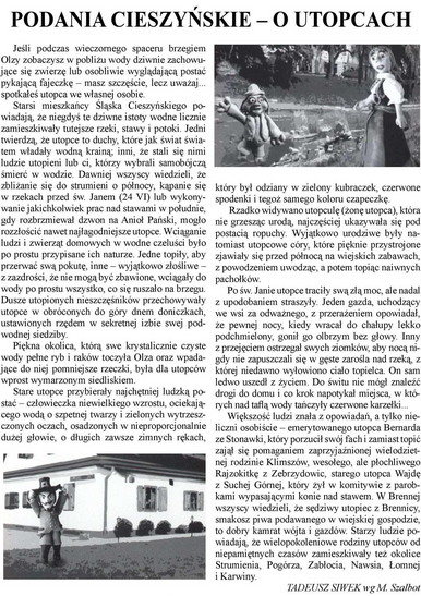Starzy ludzie powiadają, że wielopokoleniowe rodziny utopców od niepamiętnych czasów zamieszkiwały też okolice Strumienia, Pogórza, Zabłocia, Nawsia, Łomnej i Karwiny. Zdarzało się, że tego samego jegomościa widywano w różnych miejscowościach Śląska Cieszyńskiego. Zamieszkując jakąś rzekę, utopce „darły ze sobą koty” o miejsca, w których woda była głęboka, niezmącona i obfitowała w ryby. Swe podwodne siedziby, urządzane ponoć z wielką starannością i przepychem, opuszczały niechętnie - najczęściej przepędzane przez ludzi.