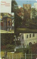 Studnia Trzech Braci. Wieża Piastowska oraz fragment podjazdu pod Pałacem Myśliwskim z fontanną stały się motywem popularnej pocztówki - składanki.