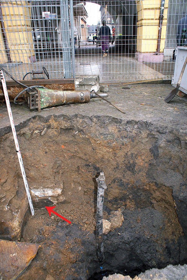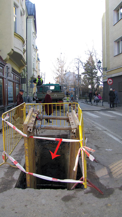 Skrzyżowanie Górny Rynek i Limanowskiego – strzałka wskazuje odkryty nieczynny zabytkowy kanał. Fot. Małgorzata Piwko