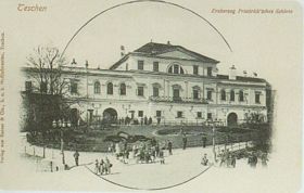 Zamek arcyksięcia Fryderyka. Zwrócona w stronę miasta fasada Pałacu Myśliwskiego reprezentuje charakterystyczną dla Kornhäusla oszczędną w wyrazie późną wersję klasycyzmu. W pałacu mieściły się biura Komory Cieszyńskiej oraz mieszkanie jej dyrektora.